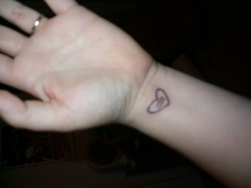 While sitting in the tattoo place, watching how easy it was for Lee, I thought I would brave up and get my little heart. I had it priced ($20), drew it, and sat in the chair. Oh lordy, I was so scared. But I had already paid for it. It was rough. Whoever said it doesn't hurt is full of crap. It hurts. I feels like an intense burn. After only one half of the heart, I wanted to stop and if it wasn't for Lee I think I might have. I HATE needles. But I did it!